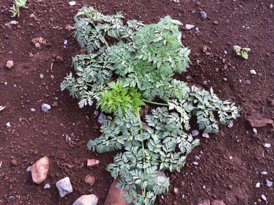 It has fern like leaves and has white flowers which form umbrella like arrangements at the top of the plant.