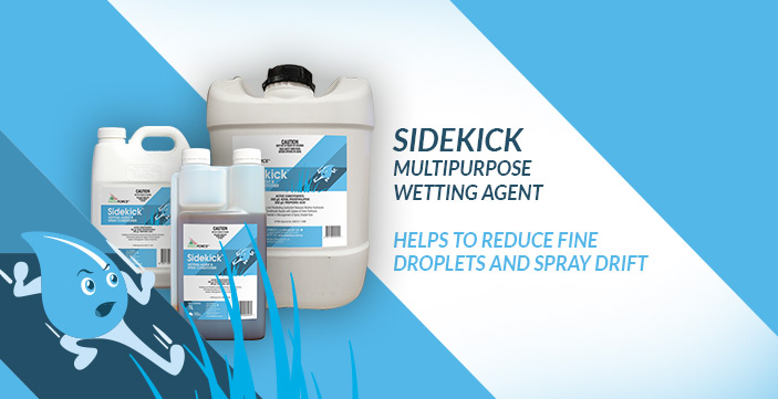 Weed Force Sidekick Wetting Agent & Spray Conditioner will reduce the number of fine droplets (<150micron) produced by flat fan nozzles, without increasing the number of large spray droplets (>400micron). Weed Force Sidekick Wetting Agent & Spray Conditioner will reduce the fine droplets associated with, but not eliminate, off-target movement of the pesticide being used. This is contingent upon good agricultural spraying practice and appropriate nozzle choice.